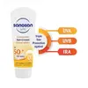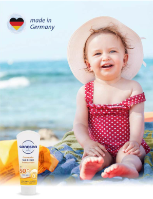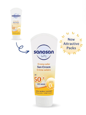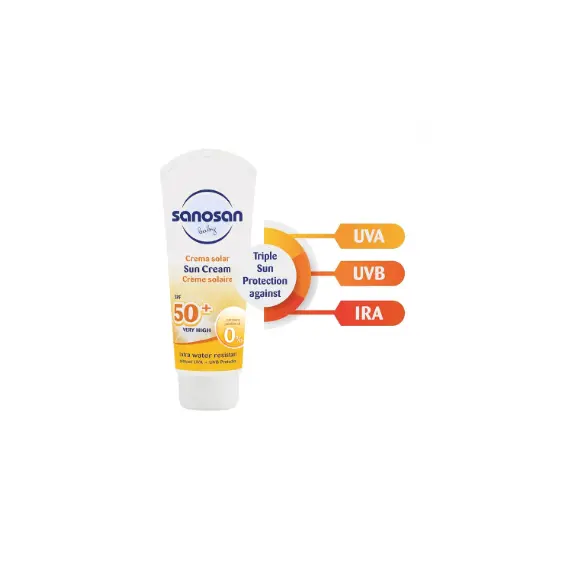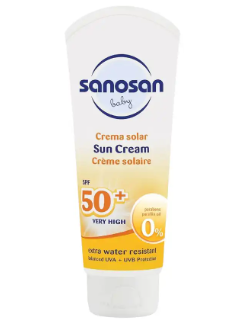 - Sanosan Baby Sun Cream SPF 50+ provides reliable protection for your baby’s delicate skin against sunburn and prevents long-term skin damage. Enriched with organic olive extract, panthenol, and vitamin E, it moisturizes and protects without parabens, paraffin oil, scents, dyes, or preservatives. Dermatologically tested and water-resistant, it ensures balanced UVA/UVB protection.