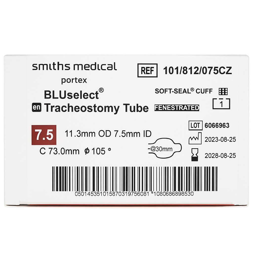 Smiths Medical Portex BLUselect® Tracheostomy Tube, size 7.5 mm, featuring a Soft-Seal® cuff and fenestrated design for easier breathing and speech. Designed with a 105° anatomical curve for optimal airway stability, with 7.5 mm inner diameter, 11.3 mm outer diameter, and 73 mm length. Made from high-quality medical-grade materials to ensure patient safety and long-term comfort.