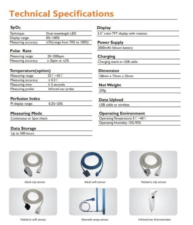 SP-20 Handheld Pulse Oximeter for Adults and Children with Charger Specifications: