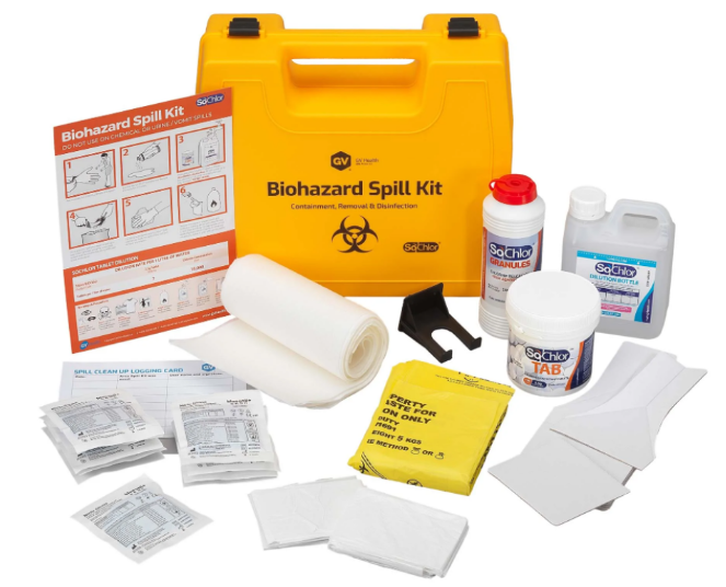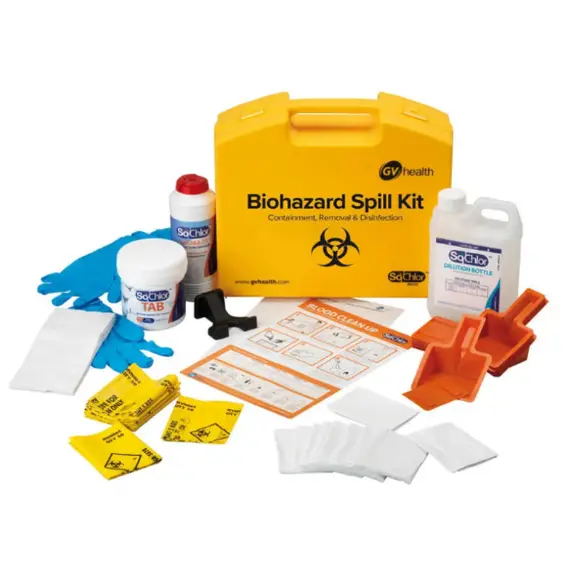 The Biohazard midi spill kit is portable and compact, containing everything needed to contain and remove spills of a biologically hazardous nature. Thanks to SoChlor technology, this kit includes products necessary to disinfect contaminated surfaces and reduce the risk of infection that might not be effectively removed using standard cleaning methods, such as paper towels alone.Thanks to its combination of absorbent granules and disinfectants, this kit can be used to clean a variety of bodily fluids. SoChlor TAB technology disinfects surfaces, eliminating pathogens and reducing the spread of infection.