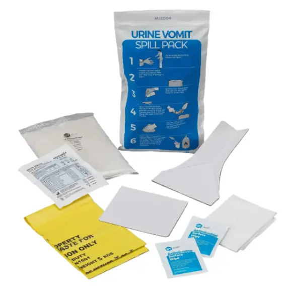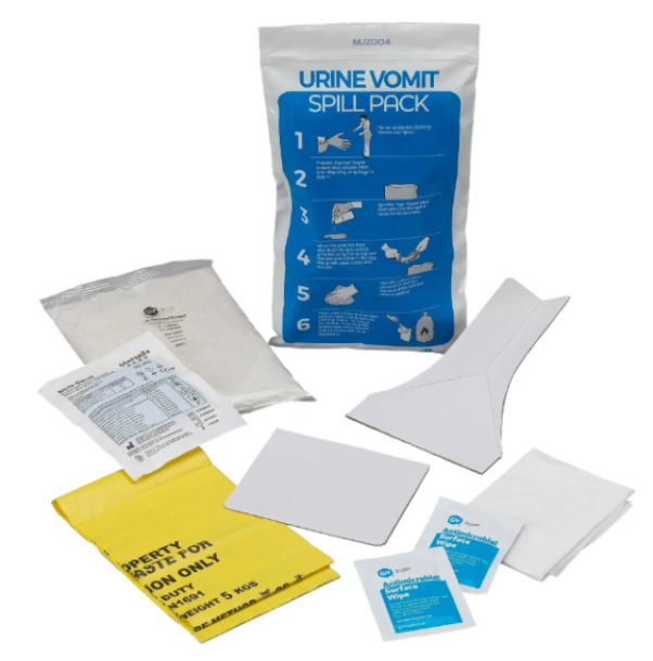 This urine and vomit spill kit is suitable for a range of spills, including urine, vomit, phlegm, saliva, and feces.