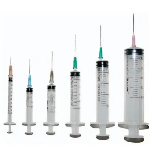 Disposable syringes, 10 ml, pack of 100 pieces. Sterile and individually packed for safe single use, suitable for injections or fluid withdrawal. Each syringe includes a fine needle for smooth and accurate administration