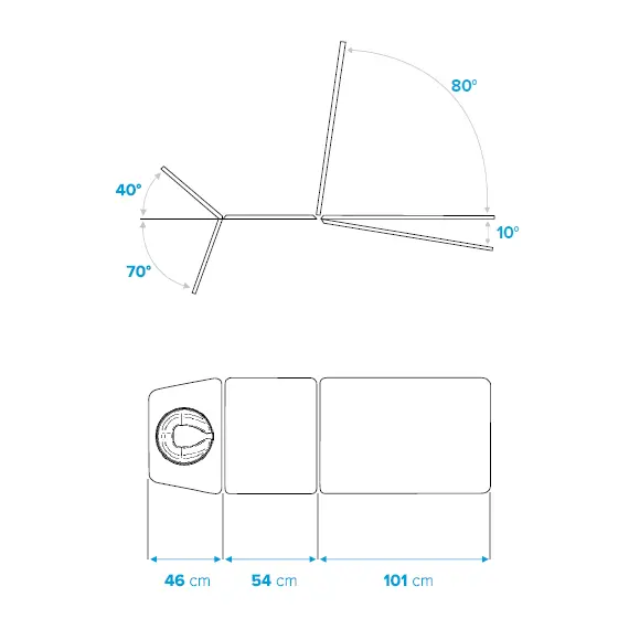 • Adjustable leg section from -10° to 80° with 2 gas springs.