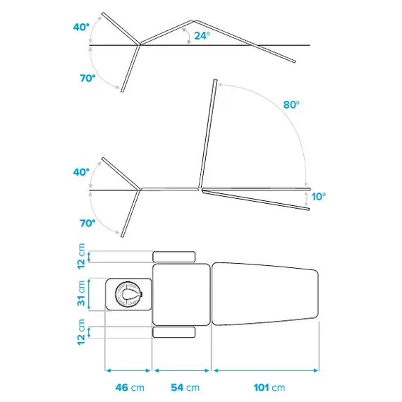 • Narrow (31 cm), adjustable head section from -70° to +40° with gas spring.