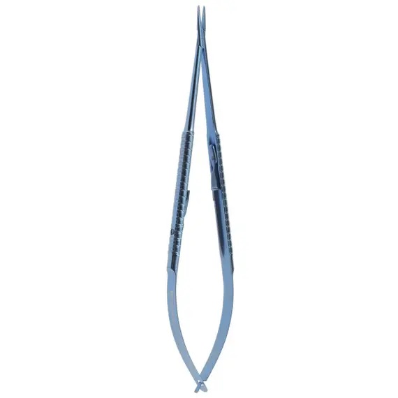 For needles: 8-0, 9-0, 10-0 Used to grasp suture needles during suturing when pushing/pulling the needle and suture through tissue. It has short serrated jaws at the distal end to provide better grip of the needle and it is available in a wide variety of sizes and designs, such as: 1) a self-retaining, scissors-like design with ring handles at the proximal end; 2) a tweezer-like design with bowed, hinged handles that are operated by squeezing them together; and 3) a heavy-duty pincer-like design. some types may utilize inserts made of hard materials (e.g., tungsten carbide) and include scissor blades. In pure titanium. Special lightness and high endurance degree. Manufactured with smooth tips for very thin needles (8-0, 9-0, 10-0) and a safety double-wing locking system. Blue anodized.