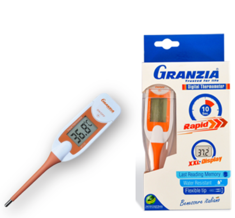 -In just 10 seconds! – With flexible tip – Antiallergenic thanks to gold sensor – Fever alarm – High accuracy (+/- 0.1 °C) – 100% waterproof – Large display & audible signal – Memory – Switches off automatically
