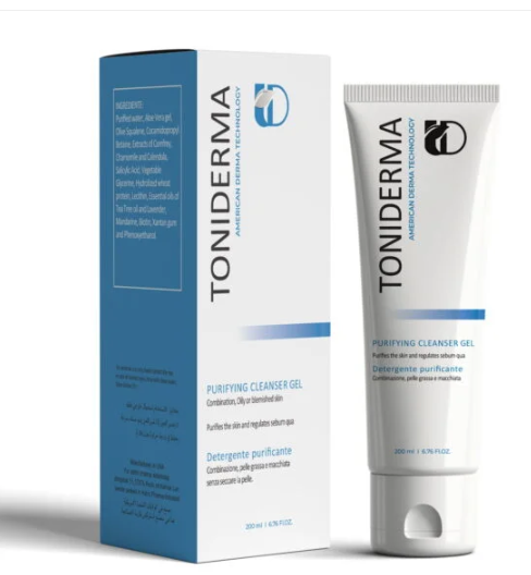 Toniderma purifying cleansing gel removes makeup and impurities while controlling sebum hypersecretions, minimizing pores, and acting as an antioxidant against free radicals. It maintains skin moisture, reduces white and blackheads, and unclogs pores, promoting cleaner and detoxed skin.