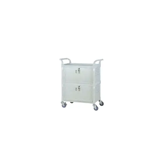 • Versatile cart configuration between drawers, flap door and open shelving • PP top and handles with 4 aluminum frames • Wide worktop with duo push handles