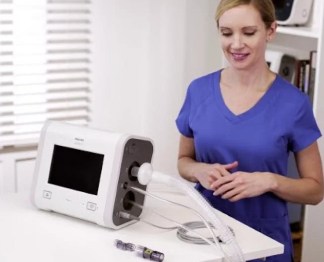 - The Evo breathing device can be connected to a blood oxygen saturation and heart rate monitor, and the readings are displayed on the side of the device's screen.