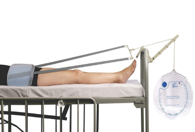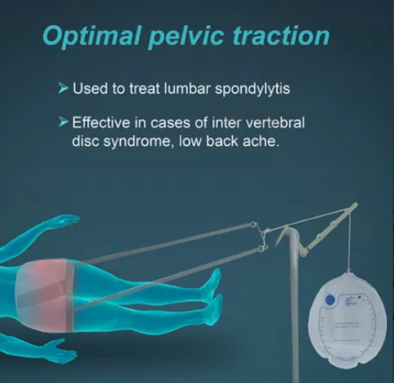 The G24 pelvic traction kit is a traction system designed to apply uniform and controlled traction to the lumbar, sacral, and thoracic regions of the spine. The pelvic traction belt, like a halter, supports the pelvic area.The pelvic traction belt is connected, via its straps on the sides, to the spreader bar, traction pulley bracket, and weights. This pelvic traction kit consists of a pelvic traction belt, spreader bar, traction pulley bracket, traction cord, and weight bag. This easy-to-use home/hospital kit is adaptable to most beds, provides controlled and uniform traction, and precisely focuses traction force. It is designed for comfortable use at home or in hospitals. Durable and robust for long-lasting use and multiple applications. The belt's large hook-and-loop area provides customized compression and adjustable sizing. The angled traction belt ensures traction force is transferred to the lower back (LS) vertebrae. It can be used while lying down. The pulley is ergonomically designed to fit any side of the bed. The soft, padded headband provides a comfortable traction interface and is easy to put on and use. A complete solution, the kit includes a traction reel support, neck traction head halter, neck traction distribution strip, 10-foot traction cord, and traction weight bag.