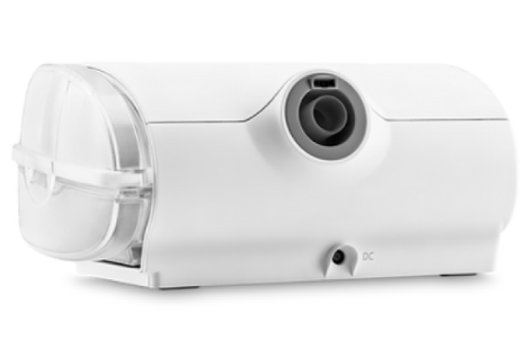 The BiPAP device comes in a lunchbox-sized box with a tube that connects to a face mask, breathing mask, or nasal plugs.